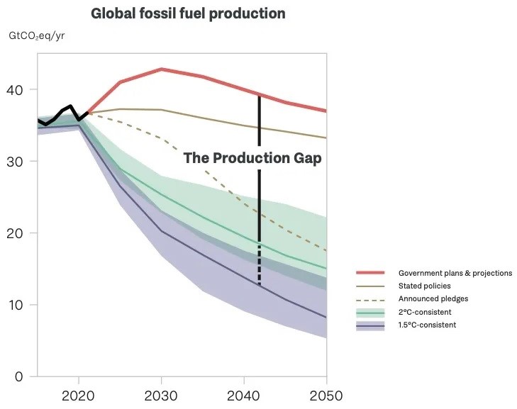 The UN environmental body (UNEP) has been monitoring the fossil fuel production gap since 2019 and has found that the gap remains large and expands over time.