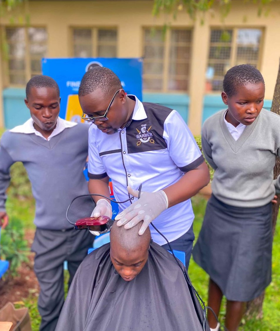 Dennis Nyagaka shaves one of the students as others stand by. The team offered free barber and beauty therapy services to the learners as part of their giving back to the community during Huduma Day. PHOTO/Courtesy.