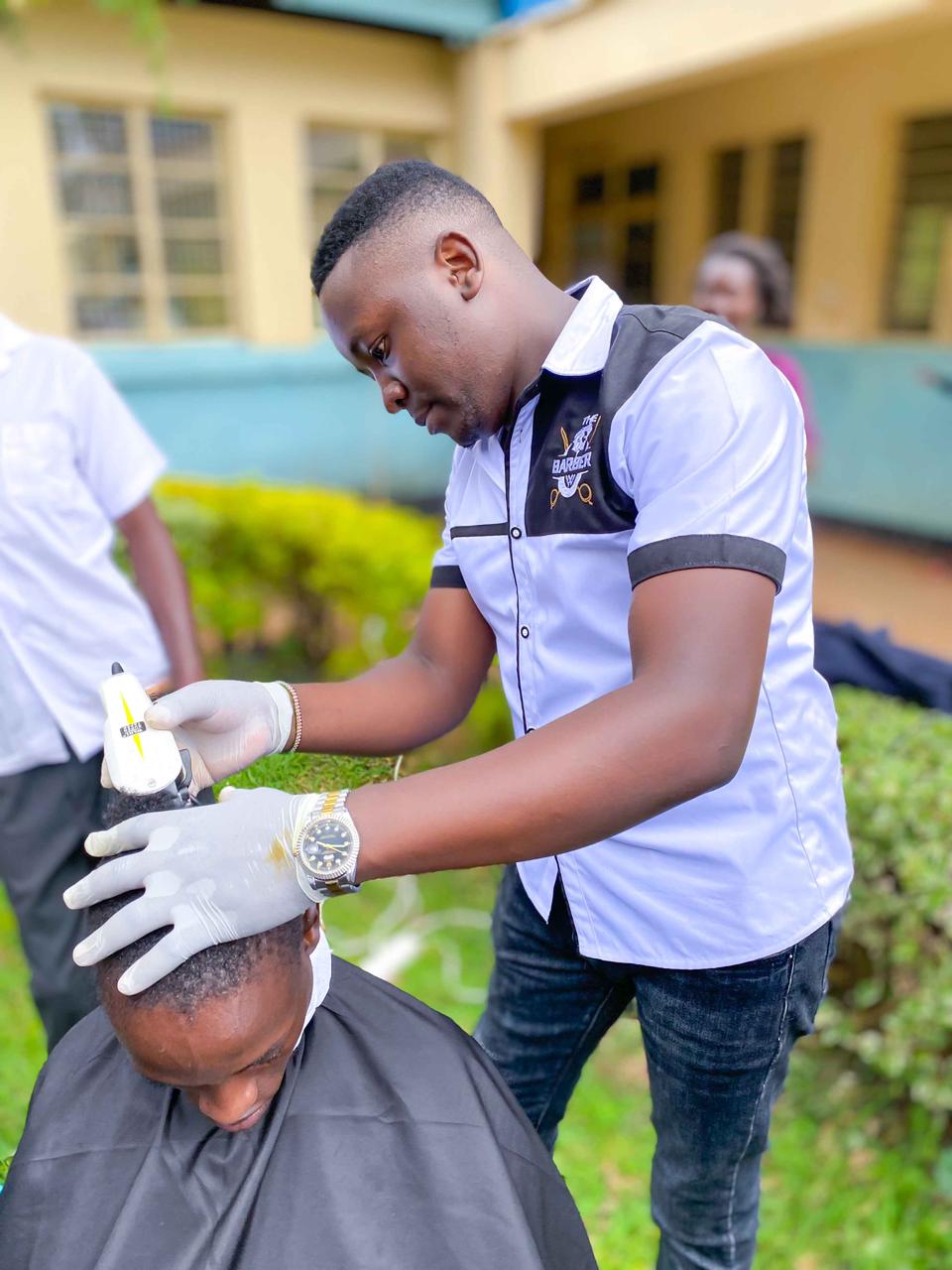 Fredrick Ounga shaving a student during the CSR. PHOTO/Courtesy.