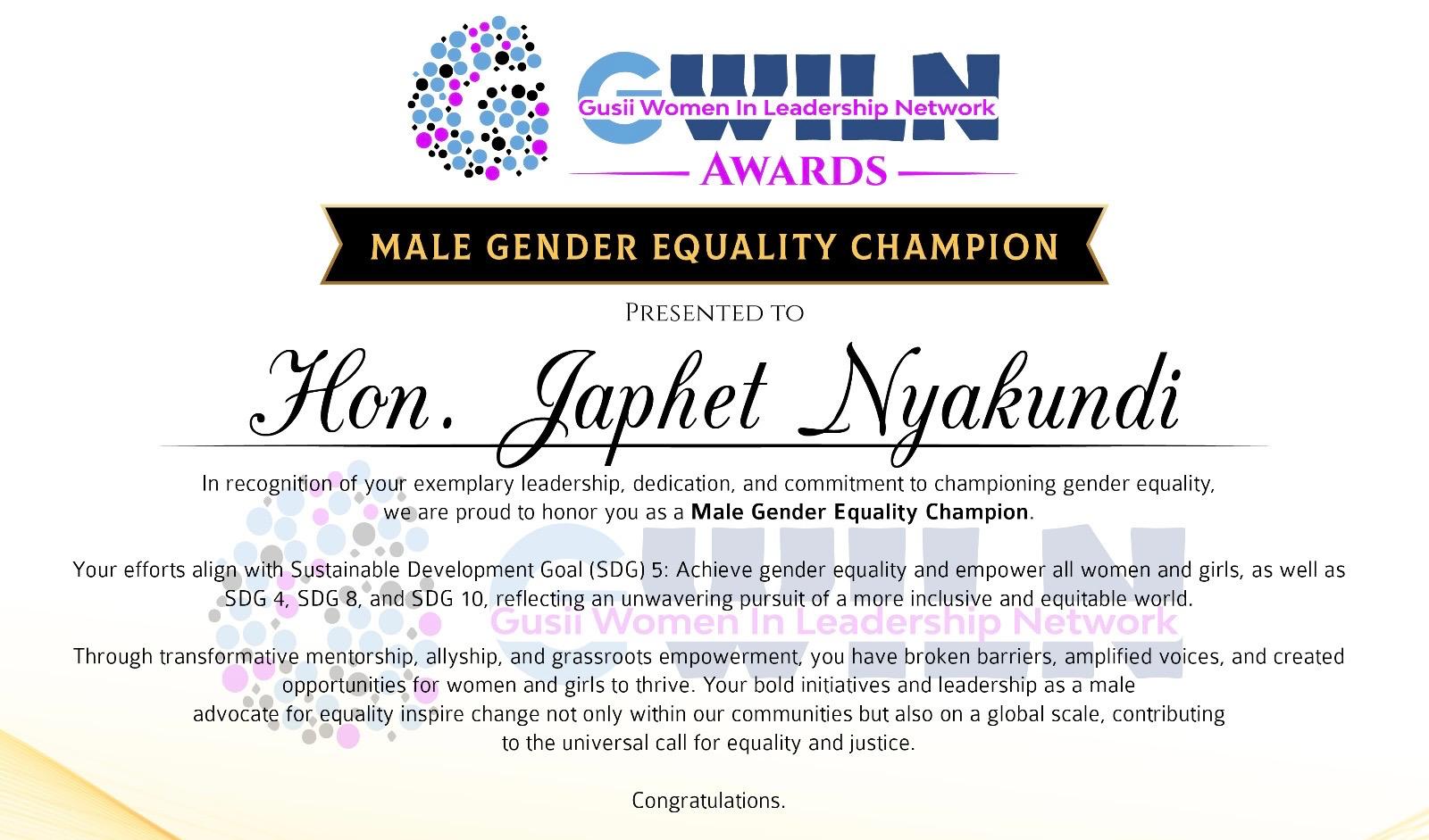 During the event, Kitutu Chache South MP, Anthony Kibagendi was named “Male Gender Equality Champion” for his efforts in championing gender equality.