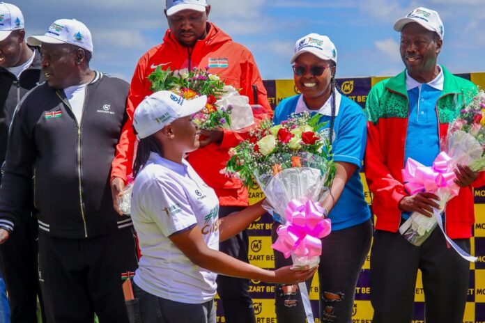 Florence Jematia receives flowers of appreciation after participating in the 8th Edition of Chemususu Half Marathon held on November 11, 2023, in Eldama Ravine Constituency. Beside her is Baringo Governor Benjamin Cheboi (left), and CS Transport Kipchumba Murkomen (behind) and further to her right, Eldama Ravine Mp Musa Sirma and furthest Reuben Kiborek, MP Mogotio. PHOTO/Janet Kiriswo, Scholar Media Africa.