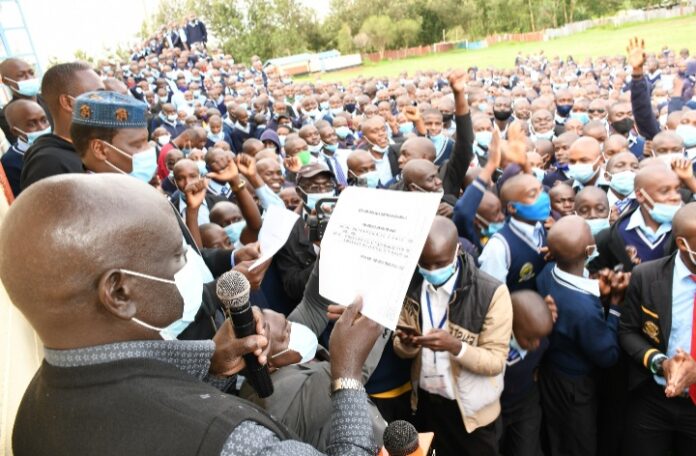 Nyambaria High School Chief Principal Boaz Owino addresses students moments after the release of 2020 KCSE results by Education CS Prof George Magoha. PHOTO/Dan Nyamanga.