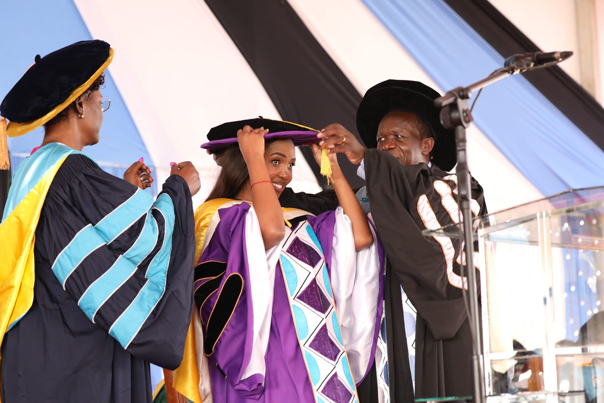 The graduands were called upon, accompanied by their supervisors to be crowned by the Pro-Chancellor, Dr. Pamela Sitienei, who the Vice Chancellor, Prof. Solomon Shibairo, assisted.