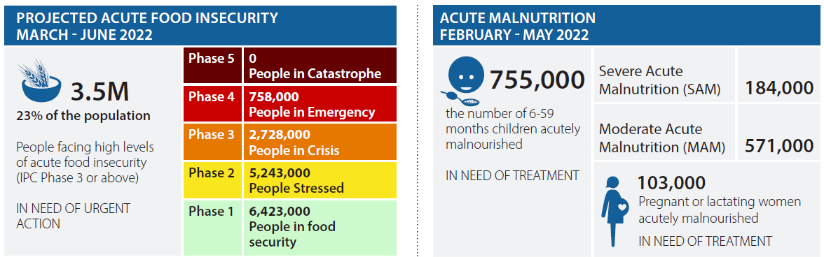 A February-June 2022 IPC Acute Malnutrition (IPCAMN) analysis released in March estimated that 755 000 children aged between 6 and 59 months were acutely malnourished.
