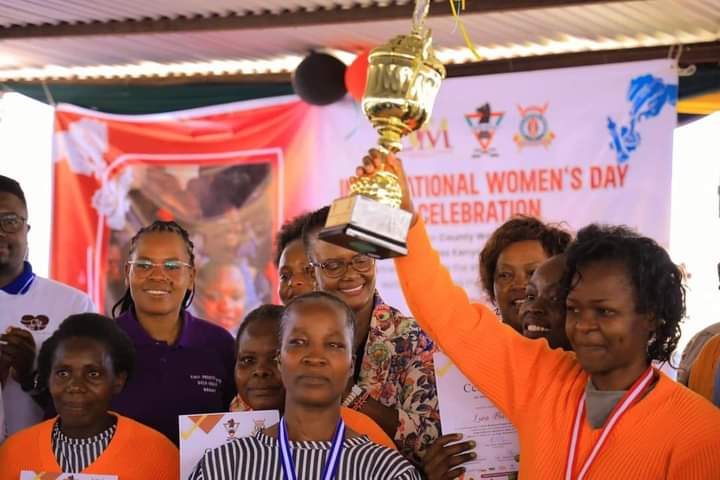 An inmate lifts a trophy as she celebrates after winning the chess competition during International Women's Day on March 7, 2024, at the Kisii Women's Prison. PHOTO/Our Reporter, Scholar Media Africa.
