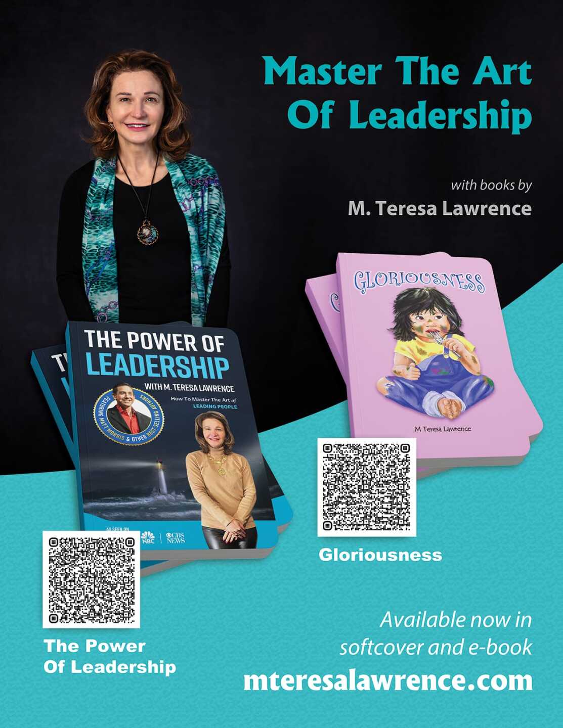 Teresa is also an author of two books about leadership: Gloriousness and The Power of Leadership with M. Teresa Lawrence.